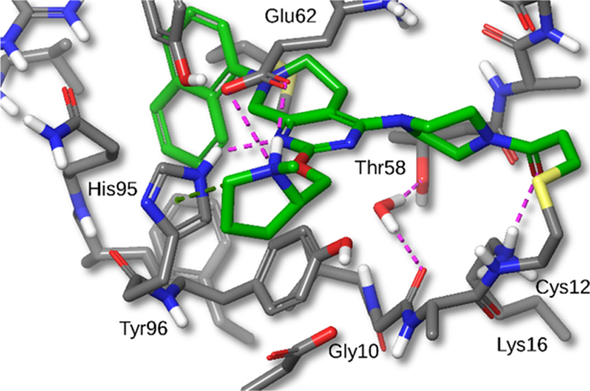 - Bound Water Displacement: The deshydroxy analogue 7 revealed a bound water molecule near Gly10 and Thr58.Displacement of this water with a cyanomethyl-substituted piperazine (compound 12a) significantly increased potency by forming new hydrogen bonding interactions with KRASG12C.